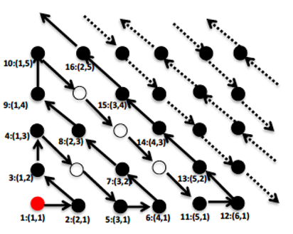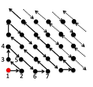 The set of points on a 2-d grid (see image above). Surely, you will say, there are more grid points in a 2-dimensional grid than the number of integers. Perhaps this set has cardinality greater than ℵ0. Alas, no. The elements of this set can mapped onto Z the integers (see image above). So, this set also has cardinality ℵ0.