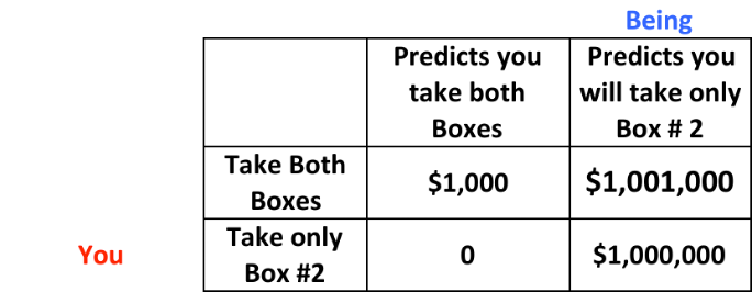 But there is a catch. Yesterday, a Supreme Being (SB) with predictive powers, made a prediction about the choice you would make. If she predicted you would take both boxes, she put nothing in the second box. If instead, she predicted you would take only Box #2, she put the $1,000,000 into Box # 2. If you use a coin toss to decide what to do, she left Box # 2 empty. What should you do?