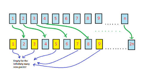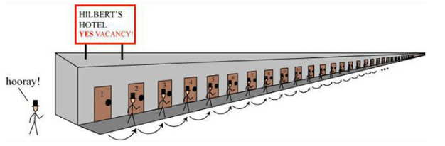 But what if an infinite number of VIPs show up and they all must have rooms? Again, it is very simple for Dr. Hilbert. Move all the guest in room k to room 2k. The odd numbered rooms will become empty, and the infinite number of VIPs can move into them. This is because the set of even integers is the same size as the set of integers. An infinite subset of an infinite set can be the same size as the whole set.