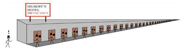 Infinity is a very strange beast. Here is how strange it can be (this is due to the German Mathematician David Hilbert (23 January 1862 – 14 February 1943)). We consider a hotel, which we can call Hilbert’s Hotel. It has an infinite number of rooms which are all occupied (No Vacancy sign outside).
