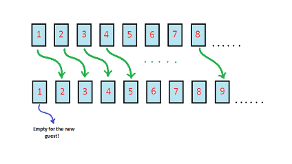 A VIP shows up and demands a room. The manager asks Hilbert what to do. No problem says Hilbert. He suggests they move the person in room 1 to room 2, the person in room 2 to room 3 and so on. The VIP can occupy room 1. This is shown below.