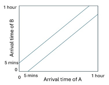 Solution: The figure below shows the possible arrival times of A and B on the two axes. It is clear that they will fight only of their arrival times are within the diagonal band in the figure. Hence the probability that they will fight is P = (602 – 552)/602 ~ 0.16. There is a 16 % chance of the duel taking place.