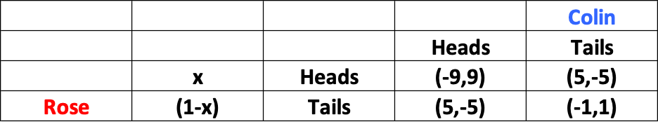 Thus, if Rose arranges her stack with 30% coins showing H and 70% showing T, she wins 0.8 cents per game, regardless of what B does. 0.8 cents/game is called the “expected value” of the game and x = 0.3 is called Rose’s optimum strategy. Unfortunately, Colin has no winning strategy. Because this is a zero-sum game, he loses whatever Rose wins. If Colin knew some Game Theory or had read this post, he would refuse to play this game.
