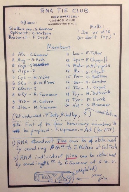 It was known that proteins in organisms were composed of 20 amino acids. Since DNA is a sequence made from 4 nucleotides (A: Adenine, C: Cytosine, G: Guanine and T: Thymine), it was clear that using two nucleotides to code for an amino acid is inadequate. Two nucleotides could only code for 42 = 16 amino acids. At a minimum, each amino acid must be represented by at least 3 nucleotides. Two physicists, George Gamow and Francis Crick, played a key (albeit futile) role in the search for this code. George Gamow was a theoretical physicist and cosmologist, who was intrigued by the challenge of deciphering the code. He believed that the best way to move forward to find the code was through collaborative effort, with the best scientists from different fields sharing their ideas and results. In 1954, he founded the "RNA Tie Club", with the aim of solving “the riddle of the RNA structure and to understand how it built proteins." The club had 20 regular members, one for each amino acid, and four honorary members, one for each nucleotide (see image above). The members all got woolen neckties designed by Gamow with an embroidered green-and-yellow helix. Many prominent scientists were members, eight of whom were or would become Nobel Laureates. Each member was identified by an amino acid. For example, James Watson was PRO for proline, Francis Crick was TYR for tyrosine and Sydney Brenner was VAL for valine.