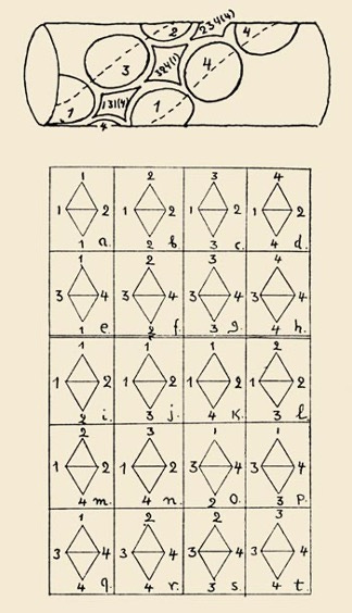 Gamow’s genetic codes: Gamow came up with an ingenious (but wrong) genetic code, which he published as a paper in Nature: “Gamow, G. Possible relation between deoxyribonucleic acid and protein structures. Nature, 1954. 173, 318.” He proposed an overlapping triplet code. His reason to propose it was that it allows the highest information density, which is much beloved of cryptographers. In his idea, the double stranded helix of DNA acts as a direct template to translate nucleotides amino acids. So, for example, the sequence ATGCTA would contain the triplets ATG, TGC, GCT, CTA each of which would code for a different amino acid. The figure below is from his letter to Watson explaining his idea.