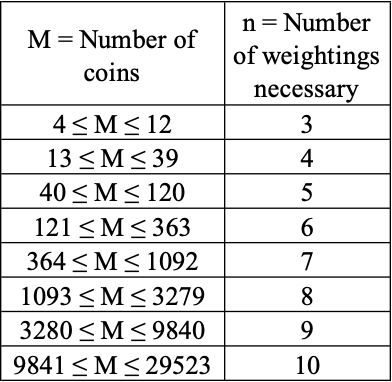 Dyson also showed that for M in the interval 3 < M < (3n-3)/2, then n weightings are sufficient. The Table above summarizes some of the results. For details, please read his paper referenced above.